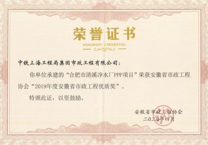 合肥市清溪凈水廠PPP項目榮獲安徽省“市政工程優(yōu)質(zhì)獎”