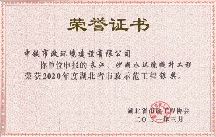 近日,2020年湖北省市政示范工程評選結(jié)果公布,公司長江、沙湖水環(huán)境提升工程項(xiàng)目喜獲湖北省市政示范工程銀獎。