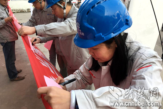 職工在承諾橫幅上簽名。